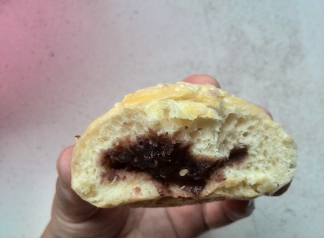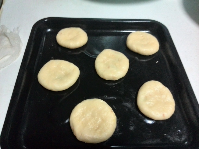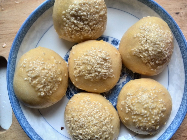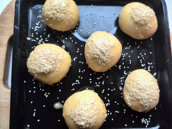 于是乎,找遍冰箱,想着做一个代表甜蜜的红豆小面包。 配方如下:主材:高筋面粉160G,低筋面粉40G,鸡蛋30G,黄油20G。 辅料:盐3G,酵母3G,牛奶100ML(原配方呢是奶粉20G,清水105ML),个人觉得牛奶可依量放,不用太拘泥于数量。红豆馅150G(我是买现有的),糖15G,芝麻适量。 做法如下: 1.将高、低筋面粉混合过筛备用。 2.将盐、酵母、牛奶、糖、面粉都混合在一起,和成面团。(在中间戳个洞,慢慢发酵至2.5倍大)基本上28度两个小时吧,我是把盆直接放入冰箱,直接发了一个晚上。 3.将面团分成11等份,再松驰个25分钟。 4.将红豆馅包入,包口向下,再次在中间按个洞,压成饼。30度再发个半个小时,发至1.5倍大。 ![]() 5.刷上全蛋液。 ![]() 6.洒上芝麻,为了颜色更漂亮,我分好几次刷全蛋液。烤箱170度预热,然后烘烤20分钟。(不同的烤箱可能功率不同,书上说只需要烤12分钟即可。各位按自己的实际情况自己掌握时间。) ![]() 7.上一张成品图。(虽然长相不怎么样,不过连一向挑剔的某位同志都说这次的红豆面包,味道不错哟。) ![]() 8.内里图。(这次的豆沙是上次做铜锣烧剩下的,所以一均分就不多了。下次一定要包得更多些,味道肯定会更好。) ![]() 送上一份迟到的祝福吧,每天都甜蜜哟。 本作品未经作者许可不得转载,转载请征求作者意见。擅自转载使用,将保留追究其法律责任的权利!