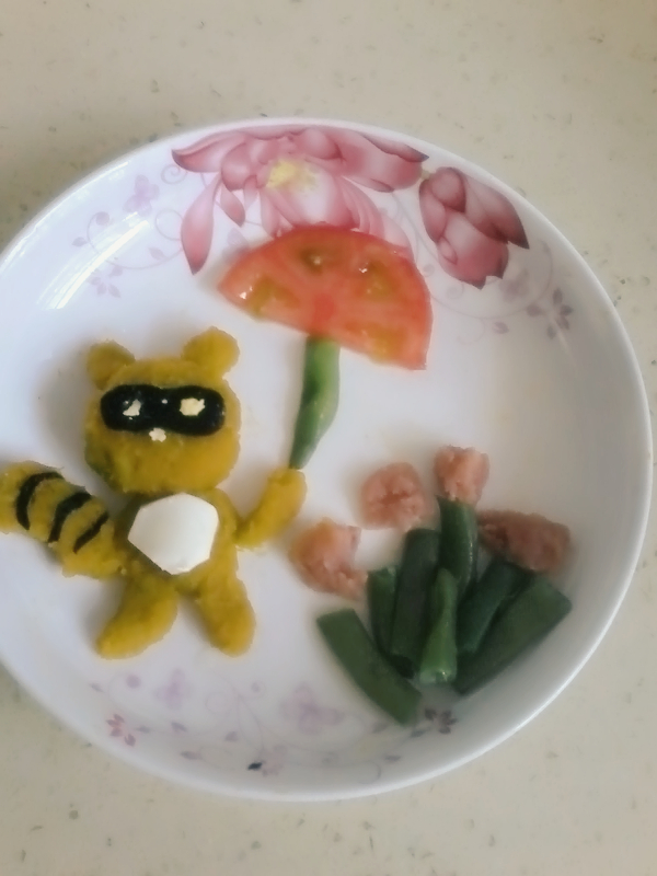 ![]() 前天晚上笑笑夜宿姥姥家.自然第二天的早饭也不用我操心,昨天晚上我们回家了今天早上吃什么昨天入睡前我就开始思考.想着想着基本上就有了一个雏形自己也慢慢的睡着了.今天早上困困的艰难爬起来就开始准备做这道可爱的小浣熊早餐了,心里的想法基本上就是做一个浣熊出来,用什么原料也是都想好的.到最终最初来是一步一步边做边想边改良出来的.最终成品出来自己也还很得意,这次这个笑笑吃的也是很开心,他吃着我去收拾房间.因为没有陪着他,他就说自己不吃的.我就停下来假装是那个小浣熊,又玩那套不要吃掉我的游戏.他得意的一口一口的把整盘子的早饭都吃掉了.哎呀,当妈真不容易我如此用心的给他做早餐还要如此用心的去陪他玩吃饭游戏! ![]() ![]() 这次做早餐的原料比较的多了,故而颜色搭配的也好看. 需要到的东西有:海苔,煮熟的鸡蛋,蒸熟的南瓜,西红柿一片,煮熟的豆角,蒸熟的香肠,盐. 过程:把南瓜切好上锅蒸熟,同时蒸熟香肠. 蒸锅下面放好鸡蛋和洗好掰断的豆角一起煮熟 这些食材全部熟了之后,把南瓜取出用勺子压成泥,开始做出小浣熊的造型就用着南瓜的原料了. 把美好时光海苔用干净的剪刀剪出眼睛和尾巴上面的花纹来放到小浣熊的身体上去. ![]() ![]() 将煮熟的鸡蛋切出小浣熊肚子的造型和眼睛的部分加上去. 煮熟的豆角加入盐也要摆放好当做一旁的装饰小草,上面加上去蒸熟的香肠粒. 切一片西红柿,准备一根小豆角做出来一把漂亮的小伞. ![]() ![]() 做起来也是相当简单的,最多也就二十分钟一道有特色的早餐就成功了. 大家来看看成品喽,很好看吧!