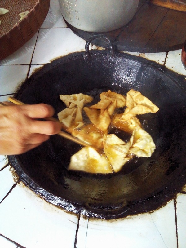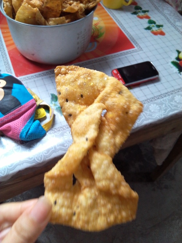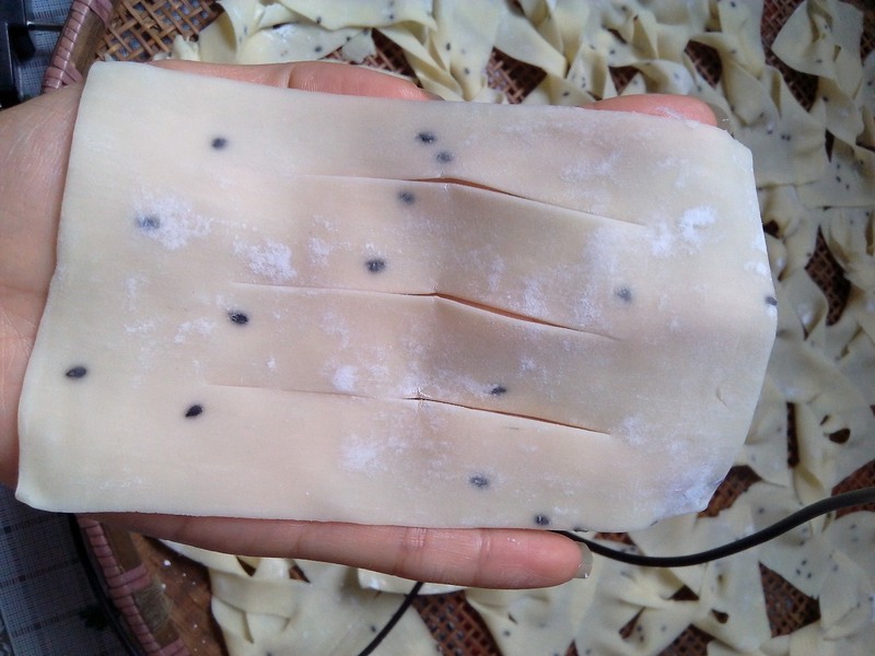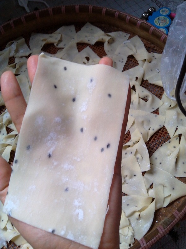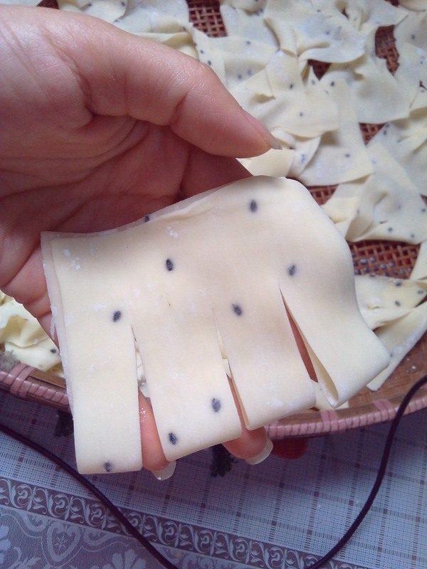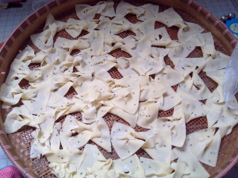 记得我们小时候,每次到七月半的时候,家里就会老少齐动员,揉面粉的揉面粉,拿工具的拿工具,铺台板的铺台板,总之每个人都有事干。当然先做的都是准备工作,等面粉揉好之后就要有功力的人来把面团擀成薄薄的皮,再切成长方形,然后我们这些小孩子再帮忙用剪刀剪成各种形状,再跟着大人把它们再加工一下才能下锅煎,哪里像现在啊,都是买的现成的皮回来加工,老实说方便是方便了,却少了很多乐趣。