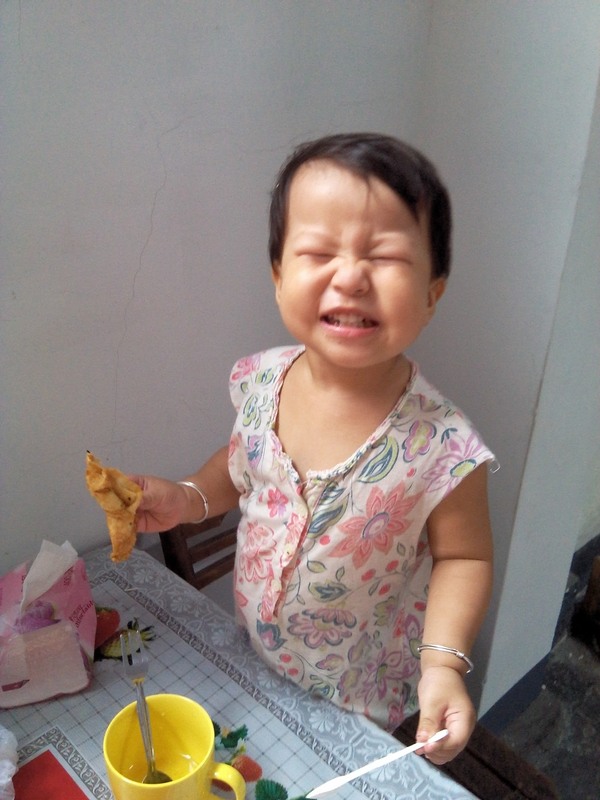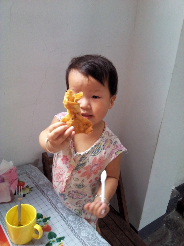 捞起来之后可不能马上吃哦,一个烫,再一个刚起锅的油炸品吃了会牙疼的。所以得把它放到一边沥沥油,冷一冷再吃。小皮球是没吃过这个东西的,所以吃起来特别的开心,明年再多弄几个花样让她尝尝 。