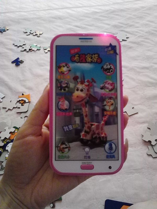 可别小看了这个小小的手机,里面的功能可多了,有流行音乐、儿歌可以听,有故事、古诗、三字经可以念,要睡觉了还有安睡乐曲给你催眠,无聊的时候还能自己跟自己对话,听起来是不是很强大啊? 而且手机是粉红色的,老公精心挑选的颜色。正面是一只可爱的长颈鹿。又是长颈鹿 我早说过了,我们跟长颈鹿非常有缘,家里的好多东西都是长颈鹿图案的。成长贴、幼儿手工书、衣服到处都有,好在小皮球不排斥,不然都没法交待。别看这小小的手机,里面可是五脏俱全。光儿歌就有十几首,不过都挺短的,截选的都是高潮部分嘛。小皮球最喜欢的就是爸爸去哪儿和我的好妈妈这两首,每天中午听完好妈妈就一定要听好爸爸,公平吧?![]() 故事呢一共有九个,有的我给小皮球讲过,像乌鸦喝水;有的我自己都没听过,像养牛之道、能认识自我的小公鸡、蚂蚁和蝈蝈等等,小皮球对这个兴趣不是很大,她最喜欢就是点开点去的换,人家刚开头说话她就给换了,有时候我的胃口刚给吊起来她又换了,把我给郁闷的。 ![]() 古诗和三字经还算好,都是小皮球比较熟悉的,很多她都能跟着一起背了,这个也是我的功劳啊。 我感觉这个手机唯一的“缺点”就是太灵了,因为这个手机是触屏的嘛(好高级啊),要换歌可是换类型的时候要自己去点,可是有时候手还没碰到,听了一半的儿歌就换了,给我郁闷的,这灵敏度也太高了吧。