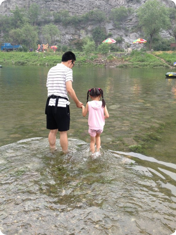 由于我们也是第一次来,摸不着情况,所以来了之后没敢往后面走,但前面一些好的地势都被占光了,我们也就挤了个边角料,玩水也不方便,后来一一和乐乐来,正好前面也没车位了,车子一直往里开,才发现后面宽敞多了,而且水也清澈许多,于是我们赶紧转移阵地,然而在这时候,天天和贝贝玩的时候,跳跃时没掌握好,摔了,衣服全湿,额头还磕破了,更离奇的是,他们居然忘记给孩子带备用衣服,其实来之前我特意提醒了天天妈妈,他妈妈也准备好了,让爸爸给装上结果爸爸忘记了。就这样,还没玩水就没衣服了,他妈妈说不行他们就回去吧,我给拦住了,说来都来了,玩玩吧,借贝贝的衣服给他穿。哈哈,后来下水的时候,小家伙过于激动,没玩几下又全身湿透,把他妈妈给郁闷的。还好去的孩子多,一一的衣服又借给他穿,嘻嘻,都是女孩子的衣服。