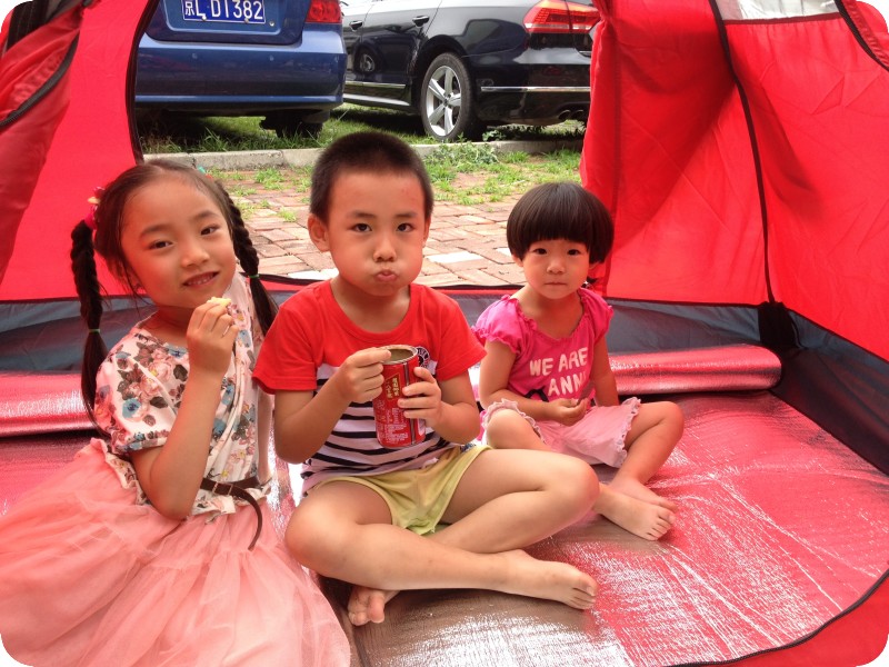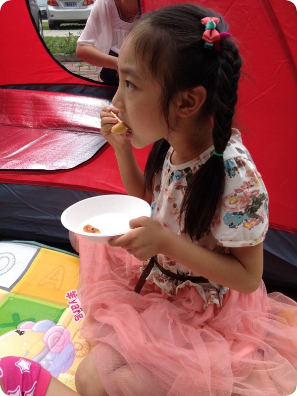 孩子们玩了一通,衣服一个个都湿透,回来换衣服、晾衣服,乐乐妈妈带的吊床派上用场,用来晾衣服 依旧是贝爸托同事从牛街帮忙给买的羊肉,我们在家穿好的。大家都各自带了好多吃的,孩子们一个个吃的很香。爸爸们依旧是下苦力的,轮流去烧烤,我妈、我婆婆还有乐乐姥姥,三个老人也有伴在一起聊聊天,女人们就忙着照顾自己的孩子,哈。