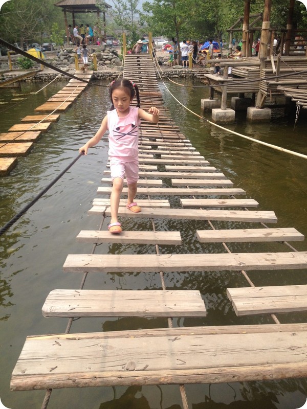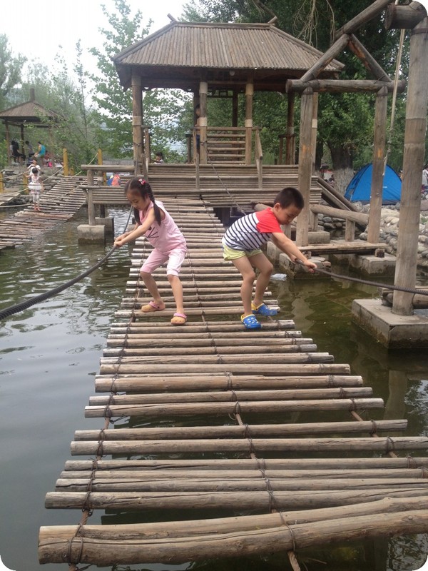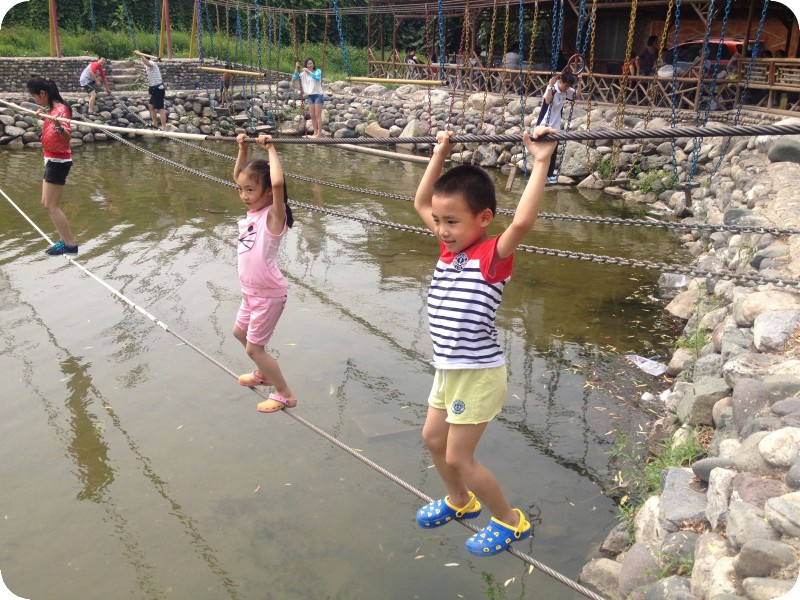 吃好了,继续去玩吧,找到拓展项目的地方,场面还是挺大的。一块是给小孩儿玩的,难度比较小,四五岁以上的孩子就可以自己玩,贝贝和天天不用大人看着了,一一和乐乐则需要大人在一旁保护,来来回回玩了很多次。还有一块场地是给大孩子或者大人玩的,小朋友大多都玩不了,如最后一张照片,是其中最简单的一项,贝贝和天天去玩了,不过爸爸们都不放心,一开始站在下面的水里走着保护他们,后来看他们还行,才不保护了。其他项目两个小家伙就玩不了啦,贝贝爸爸和一一爸爸分别都去尝试了一下,大家都要加强体育锻炼啊,哈!