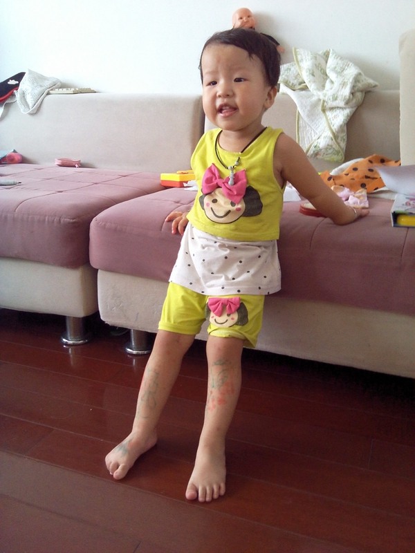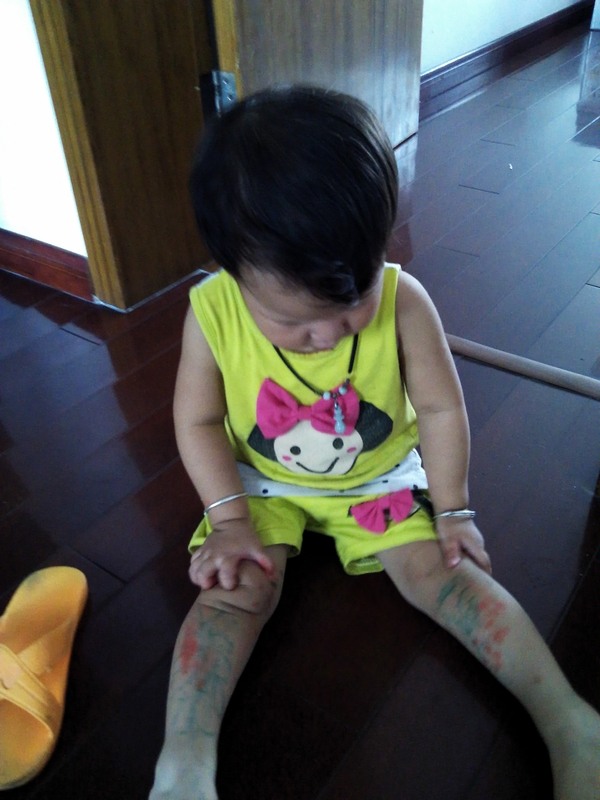 先玩蜡笔吧?家里的蜡笔是从小姐姐那里拿来的,虽然数量很多,但是能画出来的却只有少少的几只,大部分都干了没水了,毕竟时间太长了。不过对于小孩子来说,一只不也够吗?反正她就是画着玩呢。不过搬去新房以后,这些笔就没必要带去了,我要给小皮球买些新的笔。本来我跟她一起在纸上画的,后来突发奇想,何不画在小皮球的腿上呢?试探性的在她腿上画了几笔,貌似她也不反对啊,最后你瞧瞧,这腿画得花花绿绿的多好看