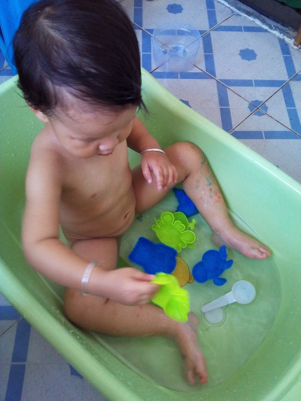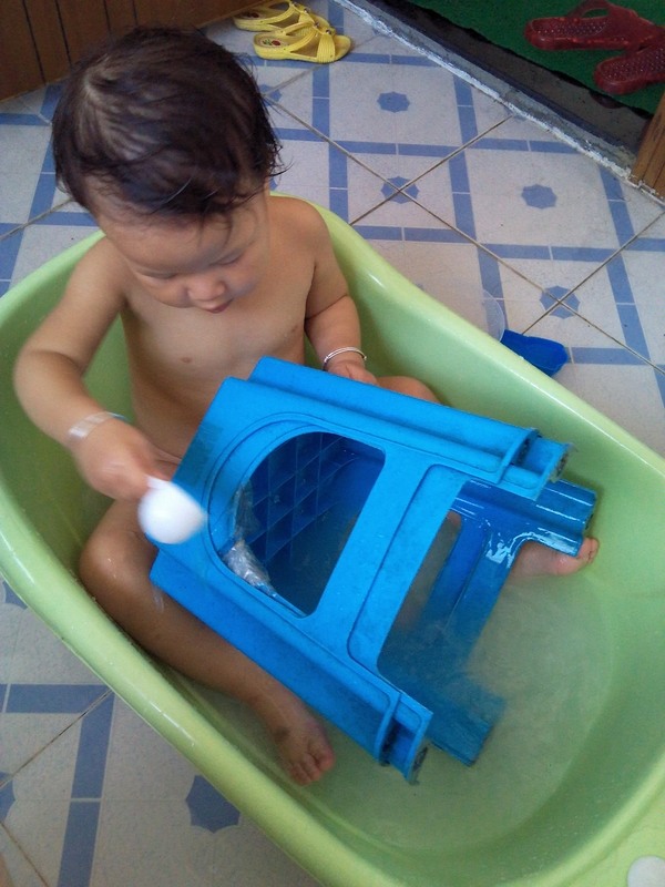 画笔玩了会,我说带她去洗手,这下可正中小皮球的下怀呀。她最喜欢的就是玩水了,没一会儿身上就全湿了。好吧,要玩咱就玩票大的,直接脱了衣服在水里玩吧。本来我是倒了些沙滩玩具给她玩的,什么海马呀、螃蟹呀、乌龟什么的,开始我陪着一起玩,也挺开心的。我们互相用沙滩玩具倒水,你倒给我,我倒给你。
