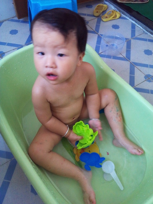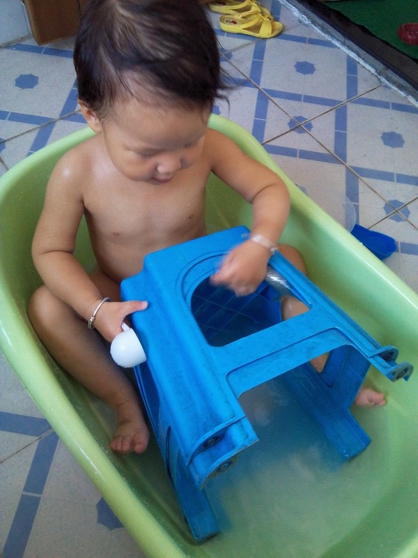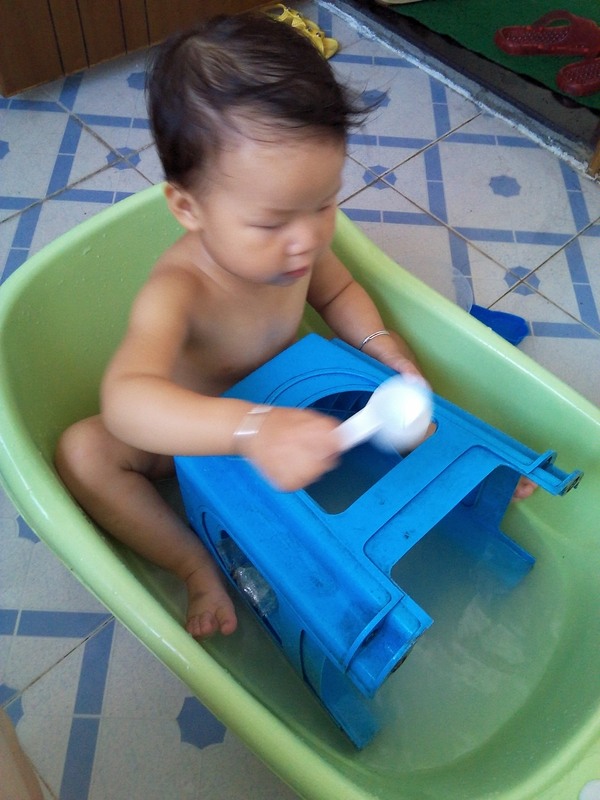 瞧这认真的表情,一勺接一勺的给凳子洗澡。浇浇这里,淋淋那里,嘴里还一直嘀咕“这里洗洗吧”本来我想阻止的,后来一想反正都已经放进盆里了,再说她也没有意义,都允许她玩了就让她玩得高兴点吧,反正也不是经常的。偶尔放纵一下也没什么大不了的