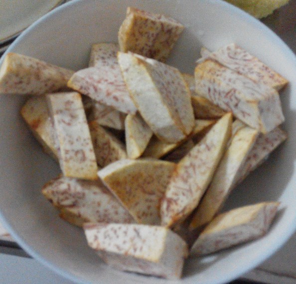 这是用来蒸的芋头,切块后炸过,妈妈说这样芋头的口感会好一点。