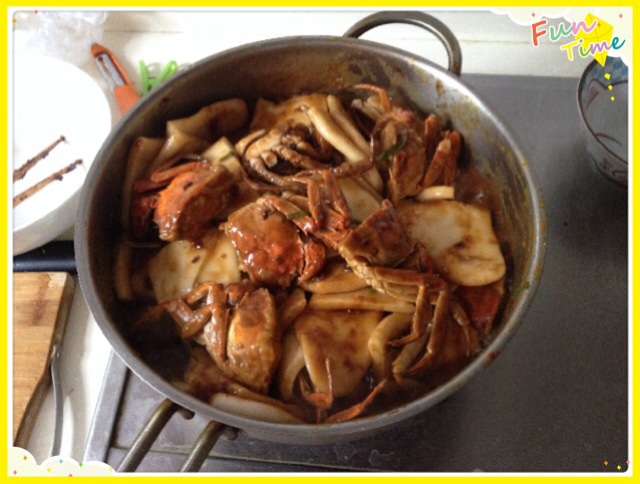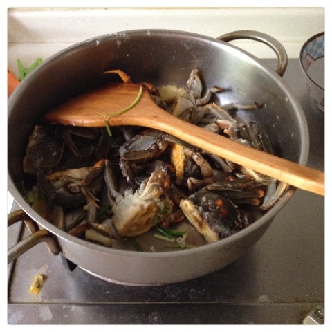 拿来旧牙刷为他们“洗澡”然后再对切。这步骤可是我壮着胆子完成的。当了“煮妇”以后,原本见个蟑螂都怕的我,居然敢捉活蟹了。把它们大切八块又有点可怕又颇有成就感。