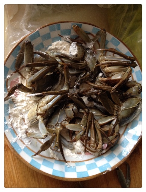 为了避免蟹肉和蟹黄烹饪的时候漏出来,会在切口糊上事先调好的面粉。(这时螃蟹的脚脚有的还在动。。。。)