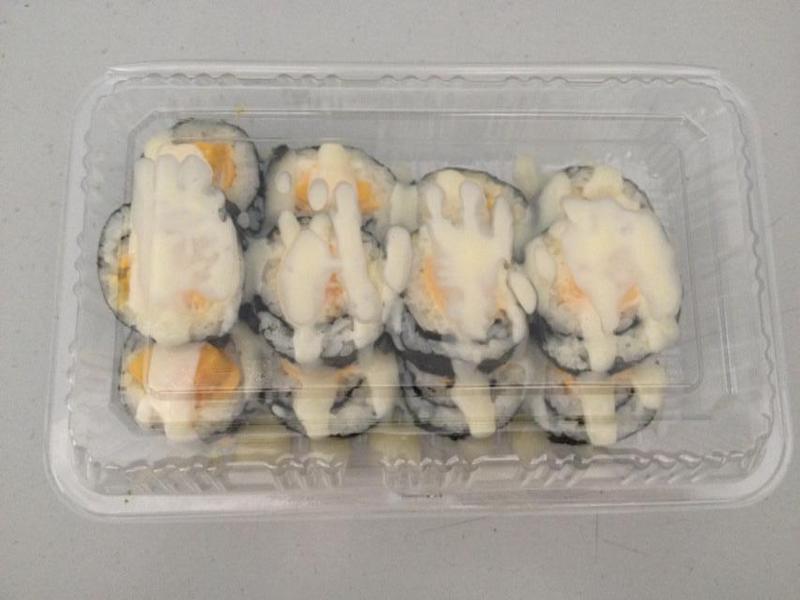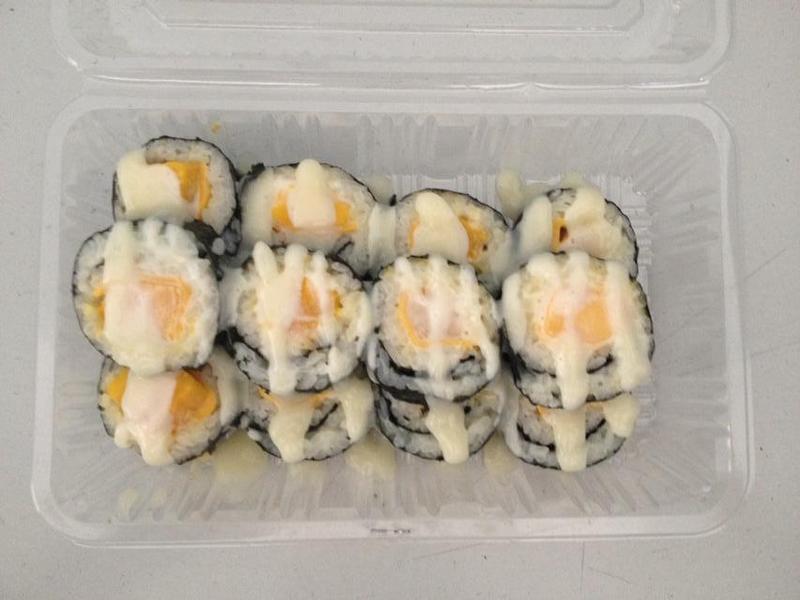 昨晚想着自己照做一下,家里还有寿司海苔,买了瓶沙拉酱,结果发现芒果好贵啊,台农芒已经过了季节,没有了,超市卖的其他两个品种都好贵啊,7.5元/斤,7.9元/斤还是那种半熟不熟的。 放弃自己做寿司,今天到寿司店打包一份过把嘴瘾, 这家寿司店是分店,之前都在它的老店买,现做现卖,最爱的是这个芒果芝士寿司了,做法也很简单,芒果也可以换成香蕉,做法是一样的。 准备一张海苔,均匀地铺上糯米饭(已经加了寿司醋的),放上一片芝士,两三条芒果条,挤上沙拉酱,卷一卷,完成,最后再浇上一些沙拉酱。这样一条切成12小块,10元一盒。 ![]()