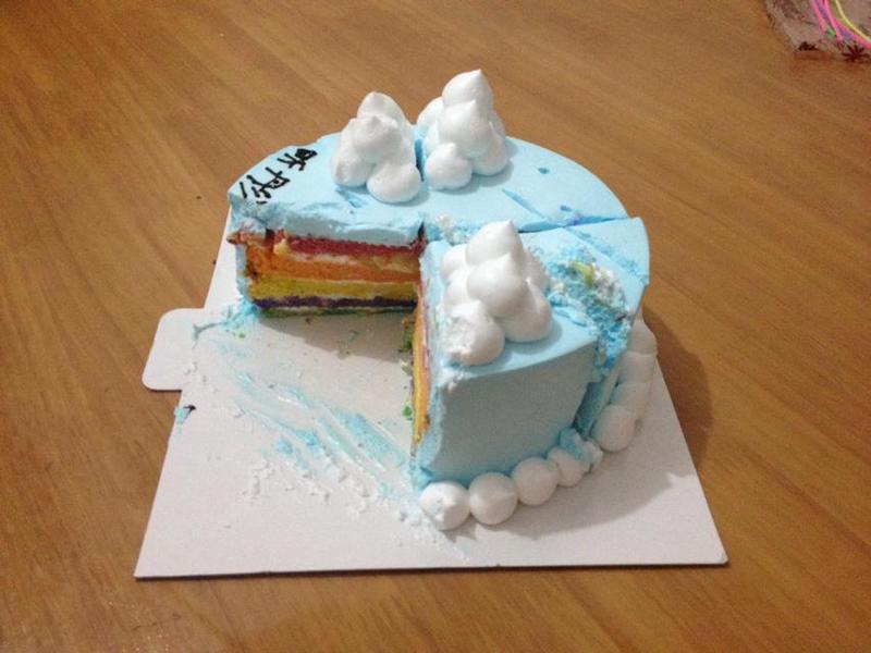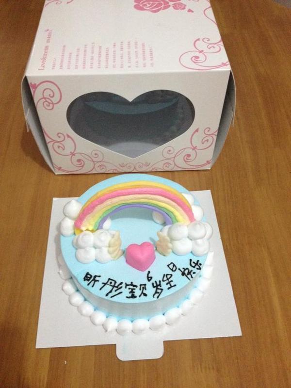 雨过了就该闪亮整片天空 让我深爱的你感到光荣 身为一道彩虹 尽全力也要换你一段笑容 够了 我爱你 不必人懂 只要你懂 ——动力火车《彩虹》 ![]() 没有蛋糕的生日会有点小失落,但是蛋糕吃多了也不易消化。小妞的生日本来打算自己做个玫瑰慕斯,但是材料不齐,就没做了。在团购网上找了许多款蛋糕,大都是大同小异。所以当我看到这款“彩虹蛋糕”时确实眼前一亮啊!然后耳边响起动力火车那首歌《彩虹》,身为一道彩虹,尽全力也换你一段笑容,够了,我爱你,不必人懂……彩虹形状,小天使装饰,淡蓝色小清新,就连里面的蛋糕也是彩虹色的! 配料写着: 鲜鸡蛋 、香港金像面粉、 韩国幼砂糖、 新西兰安佳大黄油 、长富鲜牛奶 、新西兰安佳淡奶油 、戚风蛋糕、巧克力,又打电话咨询了那些彩虹色蛋糕是用什么做的?店员回复说是果酱。 6寸,原价108元,团购价是65元,征求了同事的意见,大家都觉得好看,于是就下单订了,预约晚上7点左右去提。 蛋糕店位于我们这万达广场金街,装修倒是很精美漂亮的,有那么点高大上的感觉哈。店里橱窗摆放着许多漂亮的蛋糕模型,征得店员同意后,我就抓起手机咔嚓咔嚓拍下来, 这些蛋糕裱花装饰太漂亮了! ![]() ![]() 去提蛋糕时遇上下班高峰期,稍微晚了点,不过店员已经打包好了的。粉色缎带,心型的外包装盒很讨喜啊,提供蜡烛1包、刀1把、蛋糕叉1把、小盘1包,忘记找人家要一张卡片了,有附送的。 ![]() 包装盒上的寄语 ![]() 只能写10个字,我全部用上了,提回家后小妞一看就喜欢上了 ![]() 奶油还是厚了点,不过对比其他店的蛋糕来说算是少的。只是味道终归还是有点甜,吃一块还行,两块就觉得腻了,图个新鲜感哈!以后还是自己多努力学学烤蛋糕,学裱花,自己做的蛋糕材料好控制。