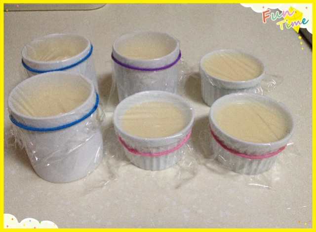 第二步:倒入容器,等待自然冷却后放冰箱冷柜一小时以上。为了卫生,我用保鲜膜封住瓶口,这里要感谢小妞贡献她五彩斑斓扎辫子的橡皮筋。