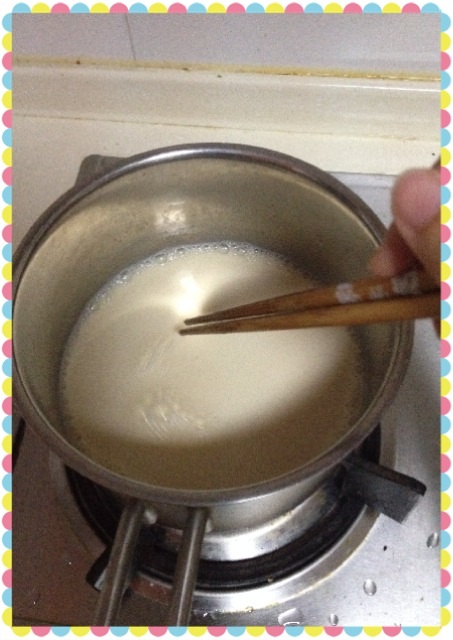 就看到锅中的牛奶起了好多沫沫,再加入布丁粉后,整个感觉粘稠起来。