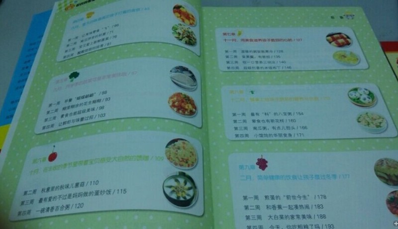 仔细看了看书中好像缺少7月8月1月的食谱,哈哈,发现这样的时间断点有点小兴奋。不过书中这么多月份每天的食谱已经都多了,足够我们来对付小家伙们了。当然还可以自己学来后自己创新。