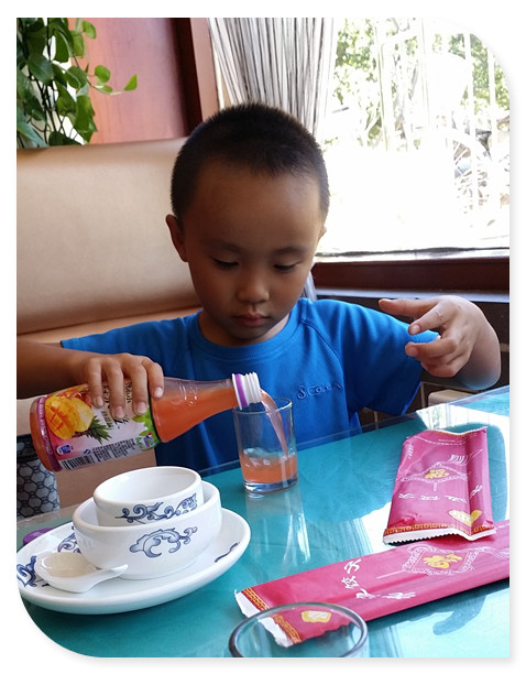中秋那天我们是在外面吃的,本来是奔着一家心仪的饭店去的,大老远的去了之后才发现人家正装修呢。没办法啊大中午的就在附近找了家算是有特色的饭店吃吧。这家的招牌是蒸饺,我们点了凉菜,糖醋里脊,蓝莓土豆泥还有一锅鲶鱼炖茄子,老字号的饭店了,菜量也大,我们一家人吃还剩了不少,其中谦第一次吃糖醋里脊,居然还挺喜欢吃的,小家伙晚上吃饭的时候还想起这道菜来了,不过菜名由“糖醋里脊”变成了“唐僧肉”,宝贝眼中的“唐僧肉”原来是这个样子的。另外“蓝莓土豆泥”小家伙也喜欢吃,谦说像冰淇淋一样的。小家伙对这家的蒸饺也大赞呢,一口咬下去,肉馅里汤汁四溢的,美味的感觉,妈妈也很喜欢吃呢!另外既然是过节当然少不了美酒了,谦也喝了久违的饮料,小家伙自己选的果汁,自斟自饮的快乐无比。大家一起碰杯,中秋快乐。借佳节,心中暗许心愿祝福我的宝贝开心,祝福我的家幸福,祝福我的亲人健康。 本作品未经作者许可不得转载,转载请征求作者意见。擅自转载使用,将保留追究其法律责任的权利! 评分记录
