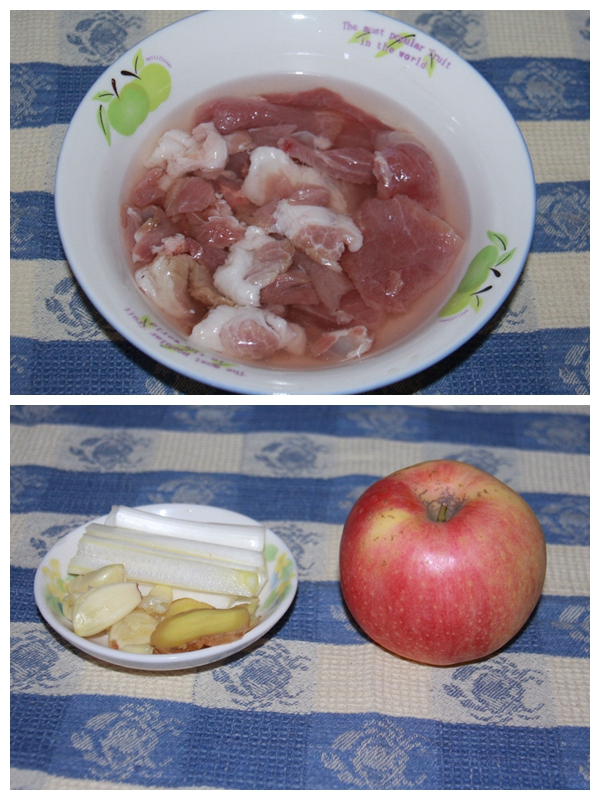 材料: 梅花肉(同样拜小超人所赐,我也终于弄清楚了猪身上不同位置的肉叫什么名字)一块,多少根据您家烤箱烤盘的大小吧;苹果一个;葱、姜、蒜;料酒、蚝油、醋、蜂蜜,有蒸鱼豉油的也放点儿吧,或者用苹果醋替代醋效果可能更好——我是粗放型厨师,从来说不准具体量哈。
