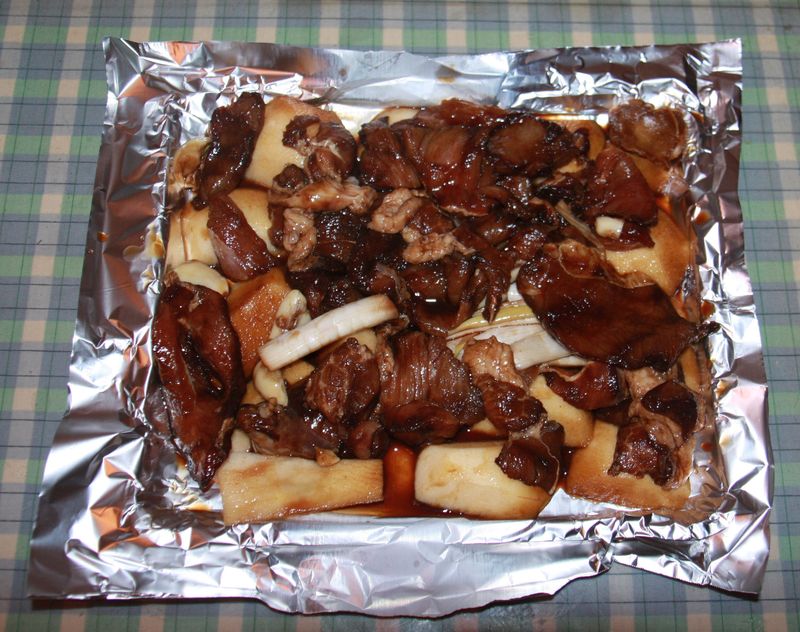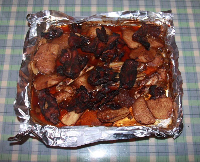 做法: 1.蒜拍散,姜切片,葱切段,苹果切块。 2.洗净切片的肉用水浸泡至少一个小时,中途换水2-3次,确保将血水充分沥净。 3.所有调味料放入一个大碗中,均匀搅拌成腌料汁。 4.把1中所说各式材料放入腌料汁,拌匀后放入冰箱,腌制24小时。个人感觉,腌制的时间很重要,入味充分才好吃。 5.一天之后,烤箱220度预热;烤盘垫好锡纸,苹果在下层,肉放上面,均匀码好。介绍中说烤60分钟,我是先烤制了25分钟,然后给肉翻面,再烤25分钟,略糊。真是不同烤箱不同脾气,必须自己摸索。