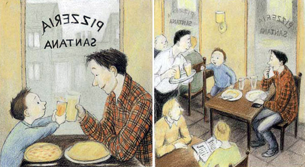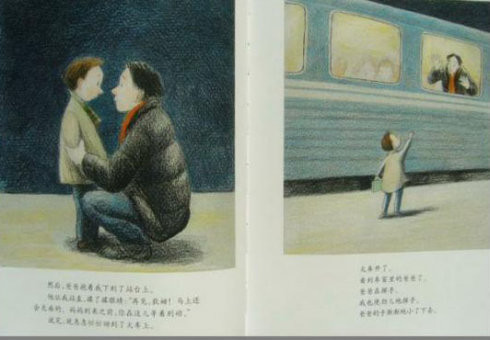 孩子听得很认真,他觉得狄姆的爸爸太棒了,陪狄姆做了那么多开心的事情,还是坐着火车来,坐着火车去上班,帅呆了! 有好几副画面都让我感动,小小的身影在车站等爸爸,送爸爸;顽皮的小家伙在餐桌前骄傲的向人们炫耀爸爸;被爸爸抱起时的惊喜和自豪还有最后一直望着离去的火车。那一刻我觉得有一种穿心的心疼,心疼这个小家伙,心疼他的那份懂事。