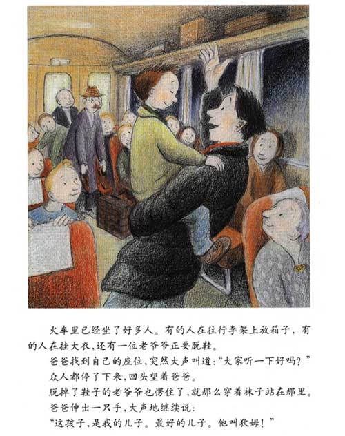 封面上的两个人正微笑着凝视对方,他们长着相似的瘦削脸庞、相似的吊稍眉和相似的小眼睛。一看就知道是父子俩。 故事发生在一个深秋的早晨。 有一个名叫狄姆的小朋友一个人站在站台上,等着火车进站。火车就要来了,他的爸爸就坐在这趟火车上。自从狄姆和妈妈搬到这个小城之后,他就一直没有见到爸爸。今天,他可以和爸爸一起过一天。他的爸爸叫焦尼。 妈妈告诉他:“焦尼到来之前,你要呆在这里不要动。”说完,妈妈就离开了。 狄姆紧紧注视着火车开来的方向。等啊等啊等,火车终于来了,它“唉——”地发出了一声叹息,“哐当”一下停了下来。车门“吱——”的一声吐了一口气,慢慢地打开了。啊,狄姆看见了爸爸!可是他听妈妈的话,呆在原地没有动。焦尼跑了过来,一把将狄姆抱了起来,还把他高高地举过了头顶。 爸爸说:狄姆,爸爸终于见到你了,我好想你,等到天黑了,爸爸就又要坐着火车离开,你想和爸爸做什么呢? “当然是做爸爸和我都想做的事情啊!”狄姆这么回答。 一出车站,狄姆和爸爸就看到一家卖热狗的小店。狄姆刚一停下,爸爸立刻明白狄姆想什么啦,他对售货员说:“来两份热狗!” 然后,他们两个人大口大口地吃起了热狗。狄姆告诉热狗店的阿姨:“这是我爸爸,他叫焦尼。” 走到电影院,他们买了两张电影票,一起去看动画片。进电影院时,狄姆告诉门口检票员:“这是我爸爸!我们一起来看电影!” 电影院里黑黑的,可是很暖和,舒服极了。狄姆知道爸爸一直在轻轻地笑,因为他看电影的时候还常常会看看爸爸。 电影放完了,父子俩去餐馆吃批萨。这里的店员哥哥跟狄姆住在同一栋公寓里。狄姆把胸脯挺得直直的,告诉店员哥哥:“今天我和爸爸在一起,他叫焦尼!” 父子两个人吃完了批萨,爸爸掏出钱包要付钱的时候,狄姆用店里所有人都能听到的声音骄傲地说:“我爸爸要付钱啦!” 他们走出餐馆,天有点黑了,还剩一点儿时间爸爸就要回去了,做什么好呢?一起去图书馆吧。坐在图书馆的长椅上,爸爸把狄姆揽在怀里,看着杂志。狄姆紧紧偎依着爸爸,心里不停地祈祷:要是时间能停下来就好了,火车要是不开就好了。 可是,时间像小老鼠一样溜走了,狄姆慢吞吞地走到借书台去借书。坐在借书台后面的图书管理员,是常常到狄姆的幼儿园讲故事的大姐姐库妮拉。狄姆指着爸爸对她说:“今天是我和爸爸一起来的,他叫焦尼。” 走出图书馆,爸爸紧紧地抱起狄姆去买小点心和饮料,就连付钱的时候也紧紧抱着他。吃完东西,离别的时间终于到了。他们手牵着手一起向车站走去。焦尼的手真大啊,都能整个儿包住狄姆的小手。 只有两三分钟火车就要开了,爸爸却抱着狄姆上了火车。火车里已经坐了好多人了,有的人在放行李,有的人在挂衣服,还有一个老爷爷在脱鞋子。焦尼抱着狄姆找到自己的位置后,他突然大声对车厢里的乘客们说:“大家听一下好吗?” 车厢里的人安静下来,好奇地看着他们父子俩。那个脱了鞋子的老爷爷,就穿着袜子站在那里。焦尼继续大声对所有人说:“这个孩子,是我的儿子。最好的儿子。他叫狄姆!”狄姆被爸爸抱在怀里,他又害羞,又自豪。 然后,焦尼把狄姆抱下火车,他蹲下下来,看着狄姆,揉了揉眼睛说:“狄姆,再见!马上还会再见面的。妈妈到来之前,站在这儿别动。” 狄姆乖乖地站在站台上,一直挥着手。一个叔叔从他身边经过,狄姆认真地告诉他:“我跟我爸爸挥手告别,我的爸爸叫焦尼!” 火车载着焦尼越走越远,很快就看不见了。狄姆心里面默默地想:火车一定会再回来吧?载着他最爱的爸爸。 书的最后一页,狄姆的妈妈来接他了,妈妈揽着他的肩膀,一起看着空荡荡的铁轨。