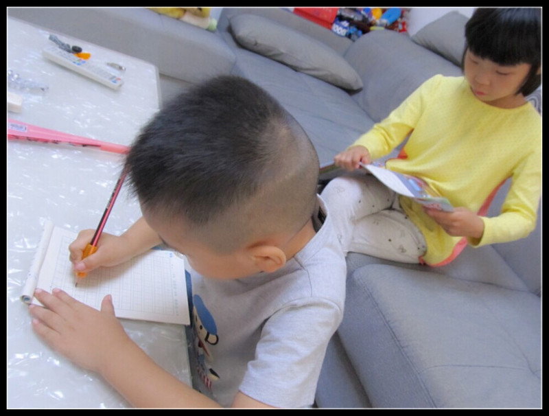 子凯做作业是可认真了,我家的要是看到有小朋友来玩的话,心思早飞了