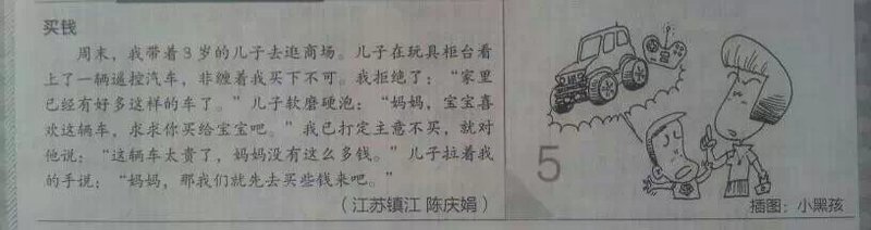 周末,我带着三岁的儿子去逛商场。儿子在玩具柜台看上了一辆遥控汽车,非缠着我买下不可。想到儿子家中已有十几辆遥控汽车堆在那里呢,我拒绝了他的要求,我说:“你家里已经有好多这样的车了,不需要买了。”儿子软磨硬泡,用无比期待的眼神看着我说:“妈妈,宝宝喜欢这辆车,求求你买给宝宝吧。”我已打定主意不买了,就对他说:“这辆车太贵了,妈妈没有这么多钱。”儿子拉起我的手说:“妈妈,那我们就先去买些钱来吧。”