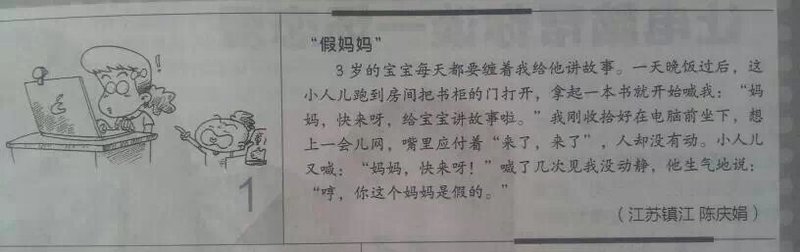 三岁的宝贝非常喜爱看书,每天都要缠着我给他讲故事。这天晚饭过后,小人跑到房间把书柜的门打开,搬出一大堆书往床上一扔——得,小人的读书时间又到了。他拿起一本书就开始叫我:“妈妈,快来呀,给宝宝讲故事啦。”我刚收拾好在电脑前坐下,想上一会儿网,嘴里应付着“来了,来了”人却没有动。小人又喊:“妈妈,快来呀!”喊了几次见我没动静,小人生气地说:“哼,你这个妈妈是假的。”