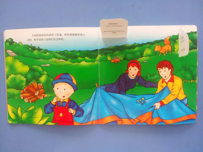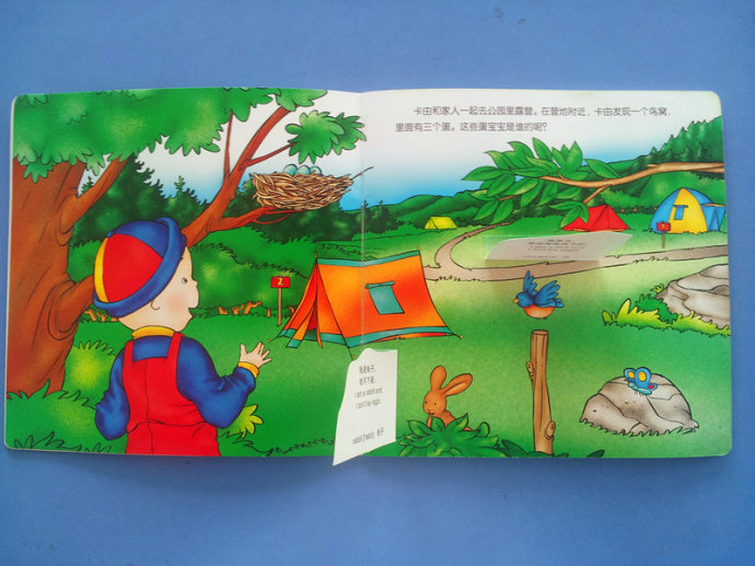 今天和大家来分享的是其中的一本《有趣的森林动物》。让我们跟着小卡由一起,看看他在森林里都遇到了哪些动物吧?他先是发现了蛋宝宝,翻开小翻页我们可以找到鸟儿妈妈,还有一只可爱的小兔子。在小翻页的下面我们还可以学习英语单词和句子哦!接着卡由还找到了豪猪、鹭鸶,鸭子和猫头鹰等许多动物。仔细看,每页上都有一只蓝色的小蝴蝶,原来这只小蝴蝶从头到尾一直在陪着我们看书呢!