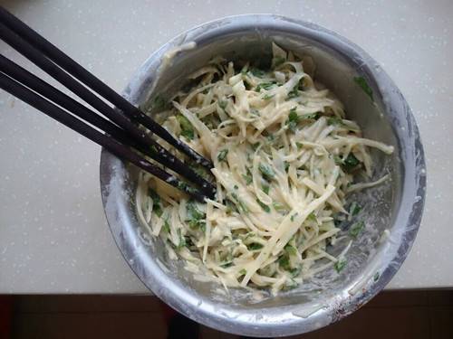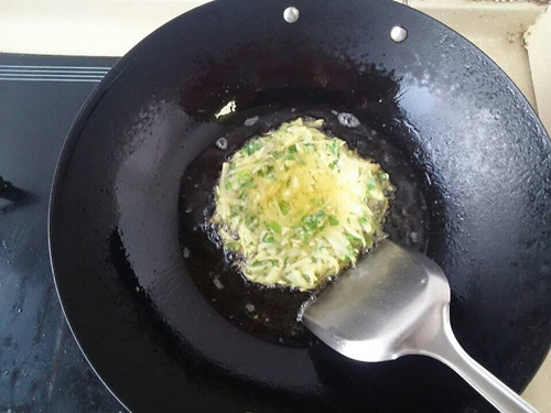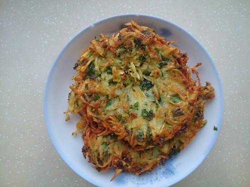 土豆切丝,面粉,鸡蛋,盐,芹菜叶,中小火煎炸即可。