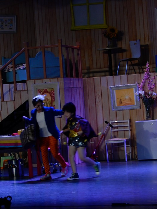 从辰辰妈妈那里拿到票后,时间还早,小朋友们就一起玩起来,YOYO、辰辰、敬仪、昊昊、珍钰等地带的小伙伴们已不是是第一次见面了,所以自动“组队”一起玩,而且就地取材,一个扫把、一个旗杆都能让孩子们玩得不亦乐乎。 ↓多多在问辰辰妈哪个是好位置啊,一共多少号啊等等,难不成想走后门找个好位置? ↓和辰辰一起玩扫把 演出快开始了,入场,等待,演出前有稚嫩的童音提醒大家把手机静音或震动,拍照时不要开闪光灯,什么时候这些看演出的礼仪不需要提醒大家就能主动的做到呢? ↓演出快开始了 ↓ 这是开场前的热舞 《魔法药水》讲了一个叫阳阳的八岁男孩儿和爸爸妈妈住在郊外的农场里,他是一个聪明又调皮的小男孩。他最大的梦想就是成为一名魔法师,而对于写作业、做家务这些事情他可不太感兴趣。