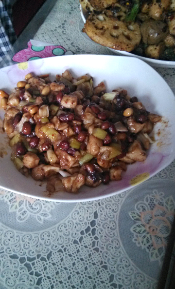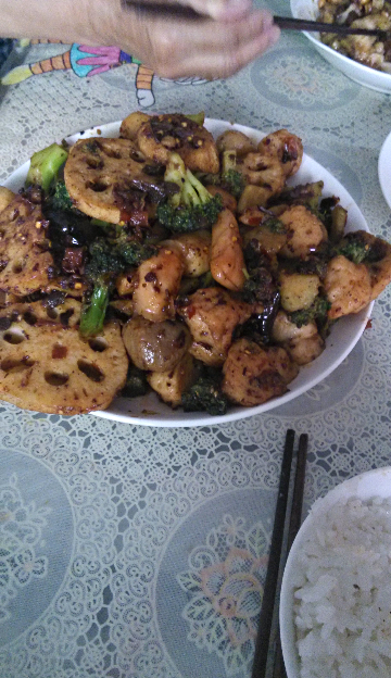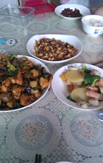 上周末我一下子就想吃宫爆鸡丁了,米乐爸说他想吃麻辣香锅,他非让我出去点个宫爆鸡丁,说那些食材家里不全,你置办全了多费劲,可我还是想试着做,但又一想我平时想做个啥就是弄食材,就做一顿,余下的材料过一段时间就扔了,有点浪费,我突然想到谁说过有卖宫爆鸡丁这种材料的,就和水煮鱼啥的一样。我去超市找了找还真有,回家按他的说明做了下,但感觉效果不如自己做,下回还是不要怕麻烦,买个豆辫酱一类的。看卖相也不咋好,凑合吧。 ![]() 麻辣香锅好弄,有现在的料,就是需要把食材切好,用水煮熟,这个藕我真心切大了,有时候想想我这人干活咋这么楞呢。 ![]() 还有我家小妞,是一点点辣也吃不了,其实那宫爆鸡丁仅有一点点可以忽略的辣,但她还是不吃,也好办,就把这些煮熟的菜和鸡丁我给她再炒一点就好了。上全家福吧。