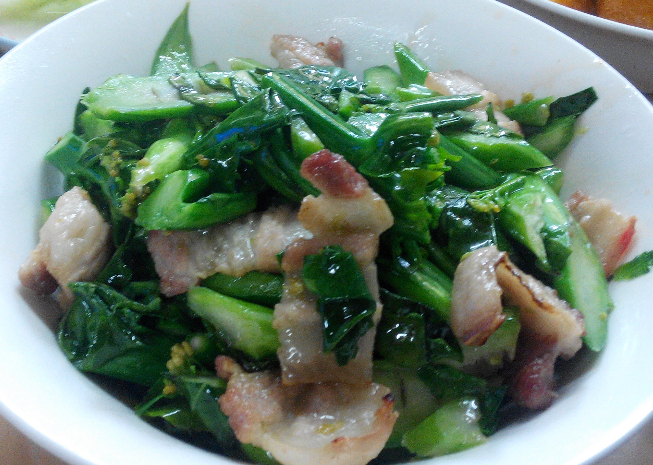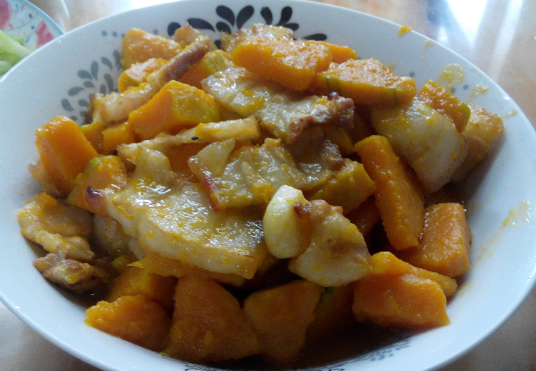 炒南瓜,非常好吃!有我记忆中家乡的风味,用很多的蒜瓣和肥猪肉来爆炒南瓜,蒜香味融入到南瓜中来,非常美味。他们两公婆都说是高血糖的,不能吃甜的,但这个南瓜却是对糖尿病的很有好处,所以他们说这个可以尽量吃!