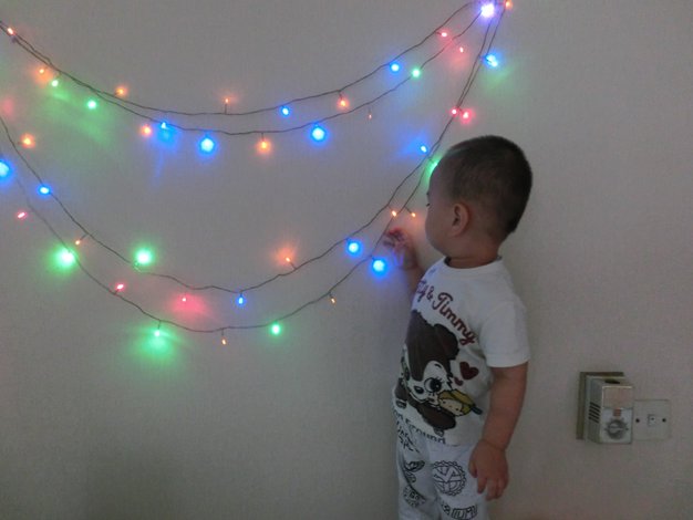 不愿意照相的小家伙 很想给添翼拍几张像样的照片,可是最近一段时间,发现他不喜欢照相了。只要一照相,总是躲躲藏藏。记得有一次,爸爸专门把他抱到门口高高的鞋柜上,想给他和彩灯一起照相。开始的时候,还好好的,看着爸爸开心地笑了,可是当爸爸拿起了照相机,情况就变了!添翼一照相,就把脸转向了一边,转脸怎么也不愿意照相。转过脸的一瞬间,看到了墙上的彩灯,便“研究”开了。