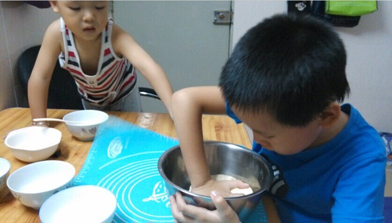 连续出门了好几天,而且还是天天晚归,确实很疲劳了,而今天4号又是宝爸加班的日子,所以我和两宝就趁机会在家宅一天,打算好好休息一下。可是没想到宅在家里也没闲着呢,做面包和披萨就花掉了我大半天的时间。大宝知道我前几天买回来一些烘焙材料,一大早就说想吃妈妈做的面包,还说想和妈妈一起做,刚好又计划明天去动物园玩玩,做出来的面包还可以带去当干粮吃,所以就决定满足一下小家伙的愿望了,而我也有很长一段时间没做烘焙了,也想练练手了。 ![]() 上午吃过早餐,带着两宝去了趟超市,因为想尝试做披萨,而披萨的有些原料还没有备齐,而且家里的白糖也没了,所以就必须去趟超市了,结果有的没的买了一堆,还顺道把今天的菜买完了,提得我手都酸了,大宝还算体贴,一手牵着弟弟还问我要不要帮忙提一点,让我觉得心里暖暖的。谁说只有闺女才是贴心的小棉袄呢,大宝也是个贴心的小暖男呢,呵呵,有点跑题了啊。采购完了东西回来,就开始动手了。想尝试一下披萨,然后再顺便做一点北海道面包。大宝本来还想要做饼干,可一下子做不了这么多东西,答应他以后有时间再做。因为是第一次做披萨,所以还得先上网搜搜做披萨的方子,找了几个方子大概看了一下,然后再综合一下寻了个比较简单的,就开始动手了。 ![]() 披萨饼皮的原料: 高筋面粉:130g 低筋面粉:40g 酵母:2g 白糖:8g 温开水:90g 色拉油:8g (我没有色拉油,直接用玉米油代替了) 盐:2g 1. 先把酵母倒入温开水中搅拌均匀,再把色拉油倒入温开水中搅拌均匀。 ![]() 2.高筋面粉、低筋面粉、盐、糖全部放入同一容器,倒入酵母水揉均匀(只要均匀即可,不用像面包一样要揉出筋) 揉面的过程,大宝一直在旁边跃跃欲试,想要帮我揉,于是我让小家伙洗干净手帮我揉,我去准备做面包的材料了。大宝揉面的时候小宝也在旁边好奇地看着,还说他也要揉,最后没办法,我在做面包的材料里多弄了一点点,一人给了一个小面团,让他们当橡皮泥玩。 ![]() 3.揉好的面团放入烤箱发酵,大概60分钟左右发酵至2倍大即可。披萨饼皮发酵的过程,我又忙着去揉做面包的面团了。 ![]() 4.把发酵好的面团再揉揉排气,再放入披萨盘整型,再二次发酵30分钟。 ![]() 5. 把二次发酵好的饼皮用牙签或刀叉弄些小孔,这样容易排气。 ![]() 6.再把自己喜欢吃的材料往上放。火腿、胡萝卜和玉米都是两宝最喜欢吃的,绿色和红色的菜椒也比较不错。 ![]() 7.先往饼皮上涂了一层蕃茄酱,如果有披萨酱的也可以涂披萨酱,然后再铺上一层火腿。 ![]() 8.然后再随便把准备好的材料铺均匀,最后再铺上一层能拉丝的妙可蓝多的奶酪。 ![]() 9.入烤箱中层,180度左右烤20分钟即可。香喷喷的自制披萨就新鲜出炉了。 ![]() 我的午餐就是半个披萨,大宝也比较喜欢吃,而小宝呢就特别喜欢吃饼上面的料,尤其是火腿就更加喜欢了。 ![]() 经验总结,第一次做出来的披萨虽然不如披萨店里的美味,但感觉还是不错,不过感觉披萨的饼皮有点厚,下次再做的时候可以考虑再弄薄一点会更好吃,还有奶酪烤得有点干,应该再考虑别的方子,先往饼皮上铺一层奶酪,烤到中途的时候再往最上面铺一层奶酪,这样可能会更美味一点。 ![]() 北海道小面包,暑假前做过好几次了,做法之前有写过帖子,在这里就不重复了。虽然隔了挺长时间没有做了,不过手艺没有退步,味道还是一如既往的好吃,这次我突发奇想,还往面包上撒了点芝麻,味道就更香了。两宝也很给力,一人吃了好几个。这种面包虽然好吃,但是做的过程当中揉面还是挺累的,但为了家里的两个小吃货,累也值呀!
