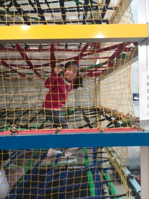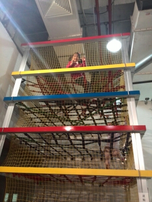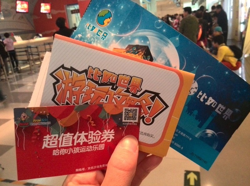 我们拿到一张比如世界十一当天上午的门票、一张比如世界的地图、比如世界50元支票(这可是比如世界内部使用的比如币哟~)、哈你小孩运动乐园10分钟体验卷。 因为比如世界是10:30才开门的,所以很多领到票的家长和孩子们都站在入口处等候着。我发现送的这张哈你小孩运动乐园体验卷的地点就正对着比如世界的售票处,看看表,时间尚早,我就带着妞儿先在这边体验了哈!大家都去排队等着比如世界开门,所以哈你小孩这边没有人玩儿呢!嘻嘻~~ 就我家小妞儿一个人,一会就爬到了最顶层!我这个淘气的妞儿啊!过了一会儿,我看到比如世界门口已经空无一人了。想必是已经开门,大家都进去了吧。我赶紧喊妞儿下来,带她进入比如世界了。