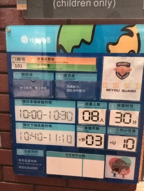 女儿一直都很想做医生的职业体验,于是我们来到手术室。这里要求是7岁以上的孩子参加的。因为做医生这是女儿一直以来的一个心愿,所以我领着女儿到了手术室,问那里的工作人员她可不可以参加。工作人员说,“你看看她怕不怕床上这个假人吧!”她带我和女儿走进手术室,看到病床上躺着一个橡胶的假人,我问女儿怕不怕,女儿说不怕。于是工作人员同意了女儿参加这个职业体验。我们在门口等了一会,这是手术室的职业体验开始了,女儿跟随工作人员进入手术室,开始她的第二个职业体验。。。 比如世界里所有的职业体验都是不允许家长进入的。所以在女儿进去做医生的这段时间,我在比如世界里随便的转了转。。。 这里有餐厅,还有小吃街,所以如果孩子们或者家长玩累了玩饿了,都没有关系,这里有很多好吃的可供选择呢! 除此以外,你们看我还发现了什么萌物~ 哈哈!