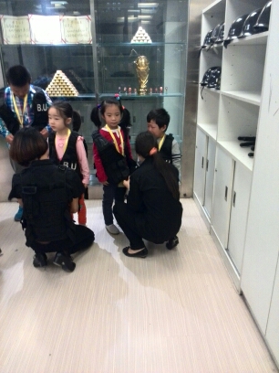 在入口处,工作人员将纸质的门票换成了胸卡交给我们,还发给了我们每人一面小国旗。因为我是要参加这个“开国阅兵式”的,所以,进了门赶紧打听这个活动在哪里参加。进门向右走,到了开国阅兵式的招兵现场。女儿被选去做特种兵了。呵呵~ 看看我家小妞儿穿上这身特警服,是不是很是像模像样的啊!来~ 再敬个军礼!哇!帅呆了!