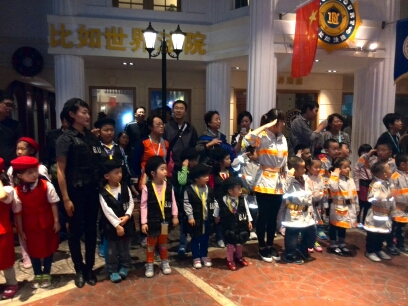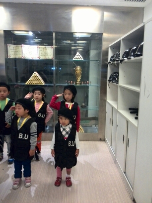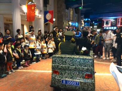 国庆阅兵大典,因为这是比如世界的国庆特别活动,而今天来参加活动的孩子们都是没有参加过,也更没有体验过的,所以比如世界的工作人员非常认真的教孩子们一遍又一遍的彩排演练。直到11点多了,活动才正式的开始。在比如世界的中央广场,这里的餐厅阁楼已经被装饰的完全就是一个缩小版的天安门城楼,在城楼上面有几个有众多“国家领导人”早已等候在那里,等待阅兵仪式的开始了。呵呵~ 大家猜猜这些领导人是谁? 对了,就是比如世界邀请的特别小演员们。 女儿走在特种兵的队列里。孩子们都很认真参加到这项全新的很有意义的活动中。
