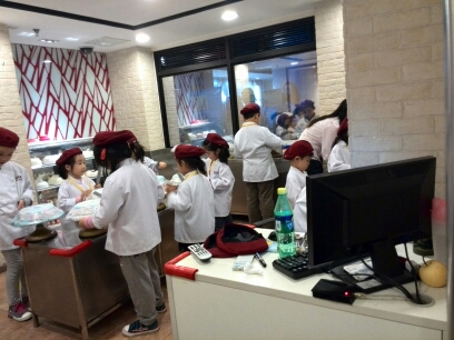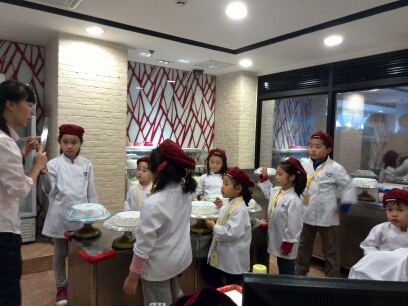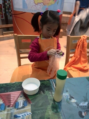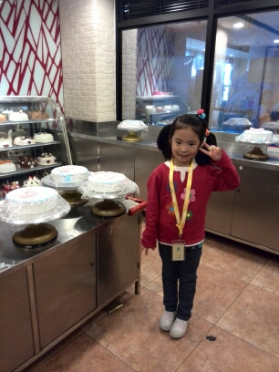 从爱大厨出来,女儿看到“味多美”的蛋糕制作。她说,上周是姥姥的生日,可以没有给姥姥买蛋糕呢。她想要给姥姥做一个蛋糕拿回去送给姥姥!我听了,真是开心啊!真是懂事的乖女儿!参加味多美的蛋糕制作是要花掉10元比如币的。女儿按要求给工作人员10元比如币,并领到一顶帽子和一套工作服。女儿很认真的按照那里老师的要求认真的涂抹着蛋糕上的奶油。。。 活动结束了,女儿出了味多美的蛋糕房。但是,这里有区别与爱大厨,这里的蛋糕是不能拿走也不能食用的!有点小遗憾了!不过,女儿终于体验了一把蛋糕师的工作,也是蛮开心的。