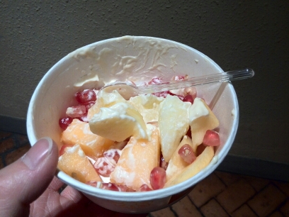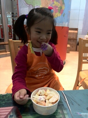 女儿的医生体验完成了,又领到了10元比如币。我问女儿刚才怕不怕啊?好玩吗?女儿开心的说不怕!好玩! 我给女儿看比如的地图,让她选择下一个项目。女儿选择“夺宝奇兵”。这个夺宝奇兵是要花10元比如币的。因为这里不是职业体验了,而算是一个探险的游戏项目了。女儿自己拿着10元比如币,排在门口,等活动开始了,工作人员出来收钱,并带孩子进入。因为是迷宫式探险活动,所以是全封闭的,家长都不能进,也完全看不到里面什么样子。。。。等了半个小时,女儿出来了,看她出来时候那神采奕奕,开心的表情我就知道她玩的一定是很开心的!女儿兴奋的给我讲述着刚才在夺宝奇兵里面的冒险经历过程,讲的是神采飞扬! 在刚才女儿做医生时候,我发现这里有一个“爱大厨”的活动,好像是新开的体验活动,不用花钱也不挣钱,是制作水果沙拉的。很有意思,制作的水果沙拉当场可以食用的。我问女儿要不要参加,女儿满心的答应了。我带女儿来到爱大厨。工作人员给女儿系上一个小围裙,还领到一只一次性手套、一个小纸碗。女儿选择一个位置坐下来,按照工作人员的要求,选择水果,倒入沙拉,搅拌,,,然后品尝!呵呵~~~ 看,女儿做的沙拉不错吧!味道更是美味呢!!!