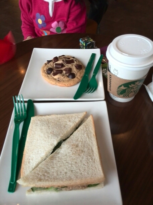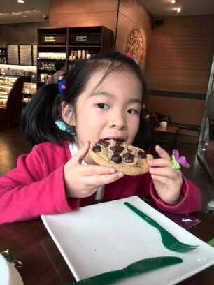 我们准备离开比如世界。可是天宫不作美,怎么下起大雨来了呢?我这一向雨伞不离身的人,今天却因为带女儿出来玩换包没有拿雨伞!呜呜呜~~ 不过,没关系,我们正好在一楼的星巴克歇歇,吃点甜点,喝杯咖啡!