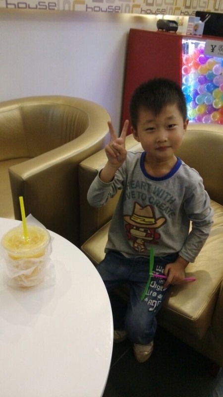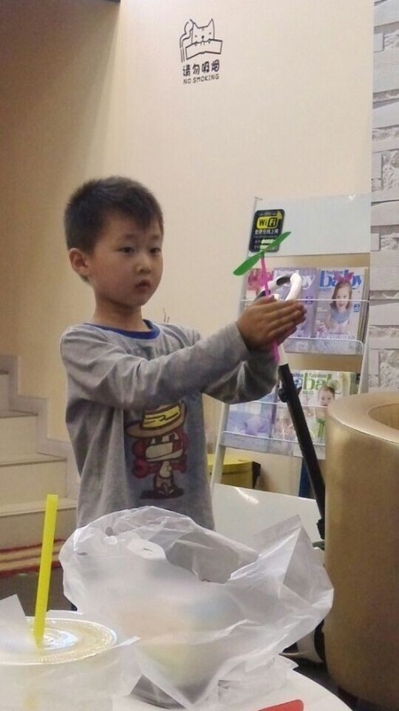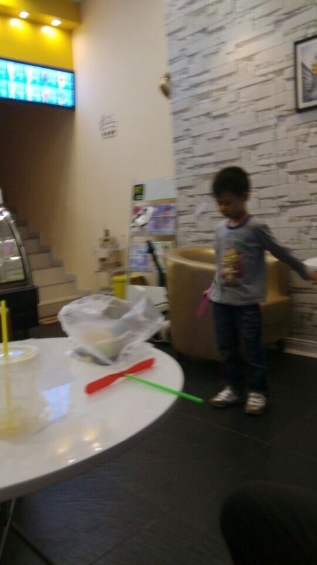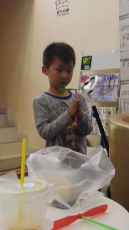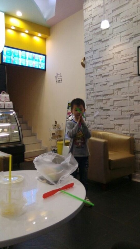 点点和爸爸一起去旁边的咖啡厅里面买了柠檬汁和彩虹蛋糕,还得到了两个竹蜻蜓,点点吃也没有心思了,就只知道玩了,玩了一会儿竹蜻蜓,不会玩,蜻蜓飞不起来,然后爸爸就教点点怎么玩,两只手并拢竹蜻蜓的塑料管子,然后两只手用力一搓,放手的时候竹蜻蜓就飞起来了,点点也这样试了一下,还真的,竹蜻蜓飞起来了,这样点点就一直玩竹蜻蜓了,还打到了自己的脸上,还要玩,飞起来的感觉真棒。