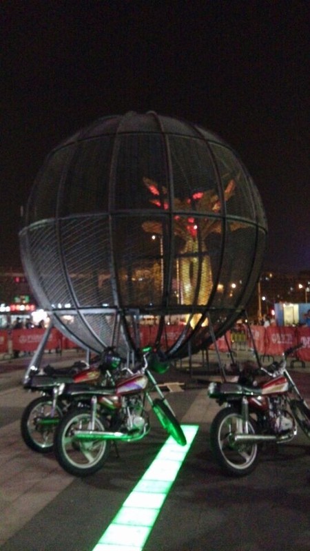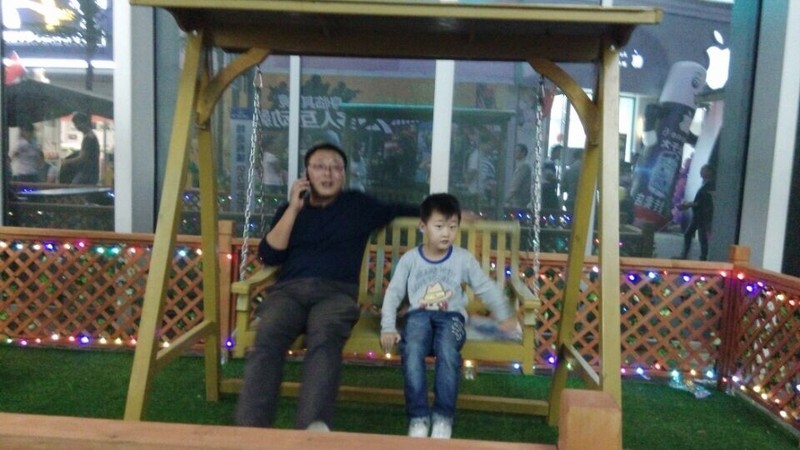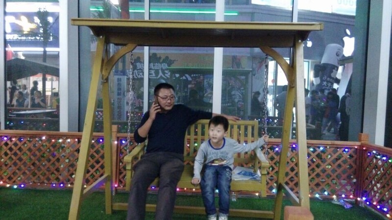看完汽车正好有笼中飞车,然后我们也去凑一下热闹,还没有开始飞的时候,旁边就有一些摩托车,一些表演者骑着摩托车到一个大铁笼子里面表演飞车,场面还是很惊险的,我们在外面看看,并看不出里面的惊险场面,还是去咖啡厅坐一会儿吧。旁边还有一个秋千椅子,点点和爸爸坐在上面摇来摇去很舒服呢,我给他们拍照,这时候爸爸正好接了一个电话。