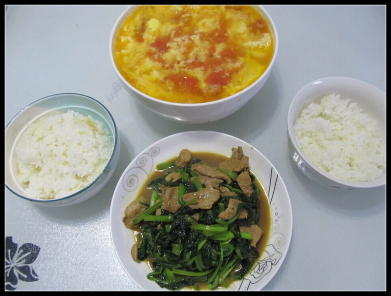 回到家我就开始顺菜,把肉和西红柿切好,鸡蛋打散,然后油菜也洗干净了。西红柿我喜欢切的小小的,这样炒出来以后再做汤就会比较黏,更入味一些。先做的是汤,这样等我炒好了油菜炒肉,蛋汤也会凉一点。油锅加热,然后放入西红柿翻炒,炒至比较黏了加入白糖,这样可以去除一些酸味,不过不能放太多,否则会容易糊锅,而且西红柿的味道就全部被白糖掩盖住了。然后加入适量的水,等煮开了倒入打散的鸡蛋,最后放入适量的盐和鸡精调味即可。 油菜炒肉是我比较常炒菜的方式了,油锅加热后先炒肉,炒至八成熟的时候加入酱油,然后再倒入油菜翻炒,最后加入盐、鸡精就好了。等我全部做好了,米饭也蒸好了,今天老公又不回家吃饭了,不过晚上给他留汤还是可以暖胃的,而且女人给男人留汤,更会让男人留恋家哦。一般给Aric吃米饭都会加蛋汤进去,不会太干,而且他也喜欢这种方式,像吃菜,Aric喜欢自己去舀着吃,不过Aric还不会用筷子,等他学会用筷子了,估计也就不再需要妈妈了。 ![]() 油菜炒肉: ![]() 西红柿蛋汤: ![]() 我和Aric的晚餐,简单,但是很适合我们。 ![]() 宝贝吃的那叫一个倍儿香,外加开心啊,Aric就是个恋家的男孩,很喜欢吃家常菜。