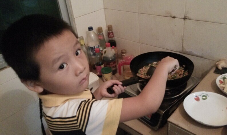 ![]() 昨天是大宝幼儿园练跆拳道的日子,所以要比平时晚一个半小时去接,我在家里把菜都洗好切好,然后煮好米饭,准备把宝接回来一炒菜就可以吃饭了。大宝因为练了跆拳道,而且吃饭的时间又比平时要晚,所以接他的时候给他带了个水果,可小家伙吃完了水果回到家里还喊着说好饿,还问我什么时候可以吃饭呀。我说很快的,妈妈炒完菜就可以吃了。 ![]() 我炒完了第一个菜,大宝就跑到厨房里来了,估计是来催菜的,小家伙看到我正准备炒他最喜欢吃的胡萝卜炒火腿肠,就在旁边盯着,看了一会儿就说,妈妈我来帮你炒吧,这个菜我最喜欢吃了,就让我来炒吧。以前小家伙总是害怕厨房的油会溅到自己身上,我炒菜的时候他都不会进厨房了,昨天真的是太阳打西边出来了。看到大宝这么积极,我也主动配合了,把锅铲递给了宝,小家伙学着我的样子翻炒着,炒了一会儿还问我要不要放盐,我说当然要了,他说他来放,我怕他放得太多了,拿勺子弄好了盐才递给他放下去。 ![]() 看到大宝炒菜的姿势,真是感叹孩子又长高了,还记得去年小家伙看我炒菜还要端个小凳子站在上面看呢,今年就不用小凳子也能够得着了。 ![]() 顺便晒晒我们昨天的晚餐吧,三菜一汤,芦笋炒肉,胡萝卜炒火腿肠、空心菜梗,再加上日本豆腐肉沫汤,还不错吧。其中的胡萝卜炒火腿肠可是大宝的杰作哦!大宝尝到了炒菜的乐趣,告诉我说下次还想帮妈妈炒菜。