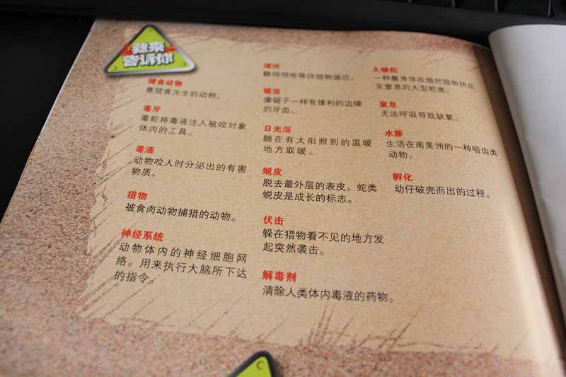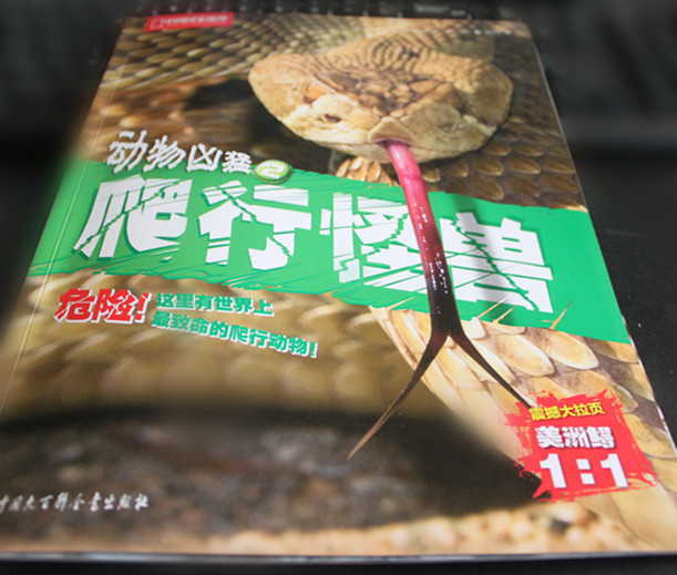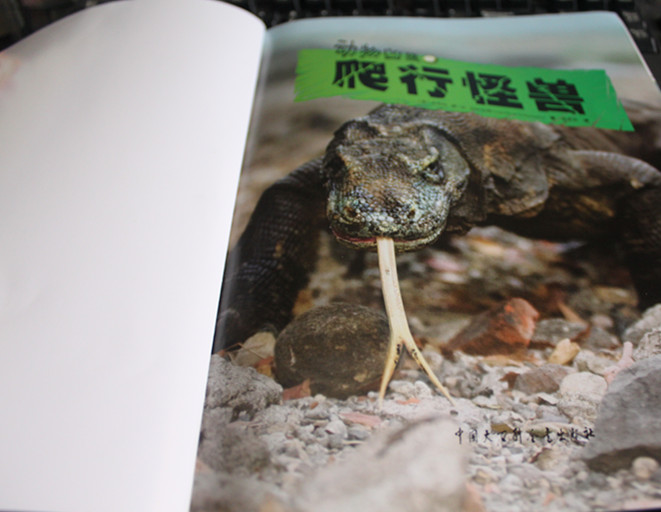 拿到这本动物凶猛之《爬行怪兽》时,我看第一眼真的觉得有些恐怖啊!看,封面上一只吐芯的蛇,不由得让人心生恐惧啊!翻开书,又是一个恐怖的图片---还是-吐着芯子的蛇啊,恐怖感再次袭来啊!