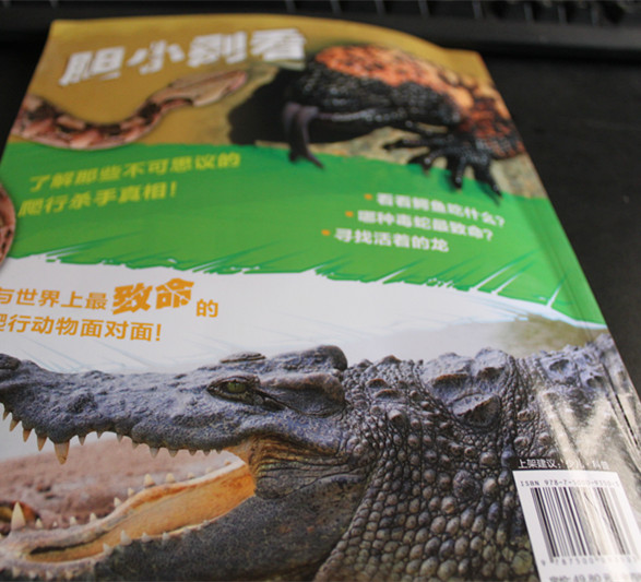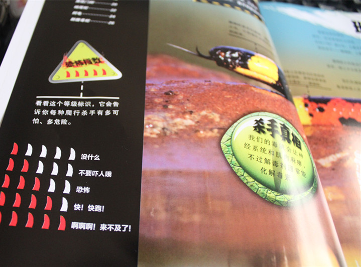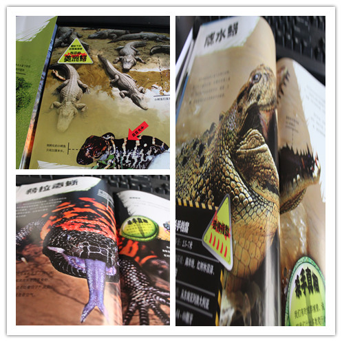 每一种蛇恐怖指数那都是相当的高啊:看,珊瑚蛇、眼镜王蛇的恐怖指数是4颗,美洲鳄、咸水鳄、太攀蛇的恐怖指数是5颗,希拉毒蜥的恐怖指数竟然是2颗……这一篇篇的看下去,真感觉晚饭都吃不下了啊!有些胆小的我不得不说,那张美洲鳄的实物大小超级震撼,更是让人恐怖不已啊!作为科普书,对这些凶猛动物有较为详细的介绍:杀手档案、恐怖指数、杀手真相、杀手的照片,还真是齐全呢!通过这些介绍,可以让读者更好的了解这些动物,了解了才能更好地避开啊!希拉毒蜥看起来真的好恐怖的啊!拍摄者是怎么如此近距离的拍出这样震撼的照片的呢!真是太让人佩服了啊!向他们致敬!