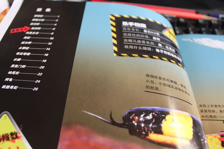 好吧,我就是冲着封面上“震撼”以及封底“胆小别看”几个字看完这本书的。书里的每一种动物都是致命的超级凶猛的,还好它们都不常见,都在那些遥远的地方——略感欣慰啊!珊瑚蛇、眼镜王蛇、美洲鳄、科莫多龙、海蛇、咸水鳄、太攀蛇、希拉毒蜥、水蟒、黑凯门鳄、响尾蛇、鳄龟、鼓腹毒蛇,看看它们的名字,几乎都是名副其实的听着都让人害怕啊!