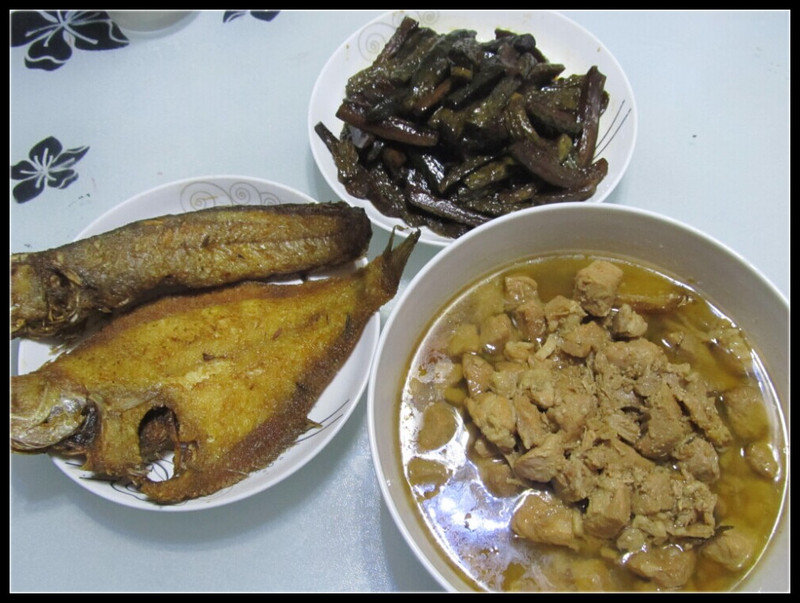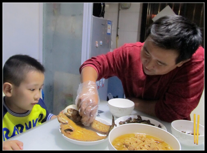 看看准备的晚餐,有红烧肉一大锅,还有煎鱼,没有青菜也不是个事。其实我家还是挺爱吃青菜的,但是这次是真把青菜给忘记了,然后Aric倒是说无所谓,妈妈做的饭就是好吃,吃肉,吃鱼就好了嘛。老公立马回答,给我3分钟,立马给你变出绿色,嘿,哪怕你现在就炒,3分钟也来不及啊。谁知老公端了个盘子就下楼了,没一两分钟就回来了,回来的时候还端了一盘老妈腌制的黄瓜青椒,原来跑储藏室去端咸菜了啊。 主食是馒头,熬了些大米粥,老公给Aric挑刺喂鱼,倒是像模像样的,看我不爱吃鱼,还教育我,吃鱼能让人聪明呢,我抑郁了,问我怎么不聪明了?老公惊讶的问,你怎么聪明的?嘿,沟通太困难了,我还是老老实实吃饭吧。吃饱喝足了,老公又叨叨了,吃完鱼不能喝冷水和饮料哦,然后倒了几杯子热水给我们,看着我们喝完才罢休。![]() 新鲜出炉的红烧肉来喽,额,我是个愿意接受批评的好厨娘。 ![]() 买来的煎鱼,孩儿的最爱。 ![]() 老妈腌制的黄瓜条。 ![]() 用心帮儿子挑刺的好老爸。 ![]() 算不上丰富,但是胜在美味,虽然我给忘记了做青菜,哎。