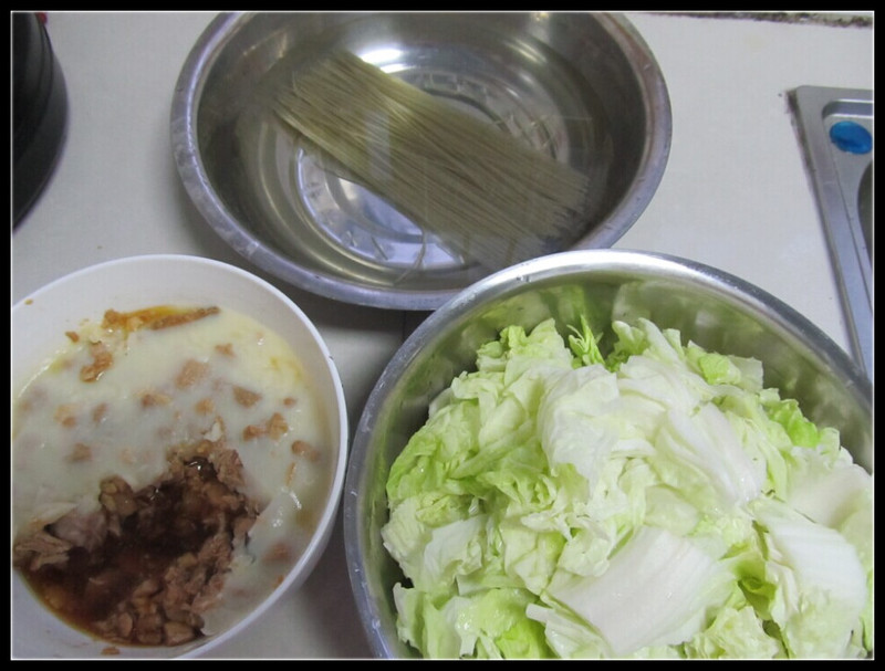 在我们这里,冬天最常吃的就是大白菜了,而且我们也很爱吃。这个春夏天我们都没有吃白菜,看到已经有卖的了,而且当季的也是比较新鲜的,就没忍住,买了一颗大白菜带回家,打算晚上做炖白菜。做炖白菜是比较适合放些粉条的,我们平时做的有猪肉白菜炖粉条,或者是白菜豆腐炖肉,都是很美味的。前段时间老公的顾客送来了一箱我们本地做的农家粉条,非常好吃,这次就先泡了半袋。没有特地买肉,因为家里还有前几天做的红烧肉,正好炖白菜吃了。 做这个炖白菜的难度很低,相信各家都有不同的做法,我就说说我家的吧,我也不知道好吃不好吃,但是Aric和老公都很爱吃,特别是粉条,每次俩人都抢着吃。先把粉条泡10分钟,白菜洗干净,然后油锅加热,放入葱姜蒜,额,这些我们都没放,除了老公,我和Aric都不吃的。如果要是用肉来炖,就需要提前把肉炒出来了,不过因为我用的是红烧肉,所以并没有先炒肉,而是先炒的白菜,白菜的量太多,炒起来也比较麻烦,所以需要随时注意不要糊锅了。